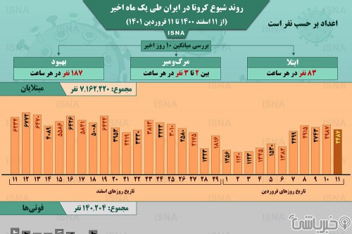 طبق اعلام وزارت بهداشت، ویروس کرونا تا ظهر پنجشنبه ۱۱ فروردین ۱۴۰۱ هفت میلیون و ۱۶۲ هزار و ۲۲۰ نفر را در ایران به طور قطعی مبتلا کرده و در مجموع تا این روز ۱۴۰ هزار و ۲۰۴ نفر را به کام مرگ کشانده است. از سوی دیگر، شش میلیون و ۸۷۳ هزار و ۶۴۲ نفر در ایران تاکنون بهبود یافته اند. بررسی آمارهای وزارت بهداشت نشان می دهد که طی ۱۰ روز اخیر ۱ تا ۵ فروردین ۱۴۰۰ به طور متوسط هر ساعت ۸۳ نفر در ایران مبتلا و بین ۲ تا ۳ نفر قربانی کرونا شده اند و در هر ساعت ۱۸۷ نفر نیز بهبود یافته اند. در این اینفوگرافیک روند شیوع کرونا در ایران طی یک ماه اخیر از ۱۱ اسفند ۱۴۰۰ تا ۱۱ فروردین ۱۴۰۱ را مشاهده می کنید.