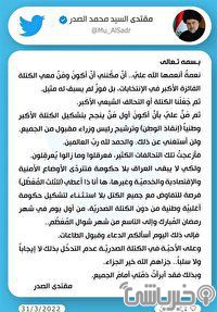 مقتدی صدر در پیامی اعلام کرد که به دیگر گروه ها این فرصت را می دهد تا بدون استثنا به مذاکره با دیگر گروه ها برای تشکیل دولت اکثریت ملی بدون حضور جریان صدر بپردازند.